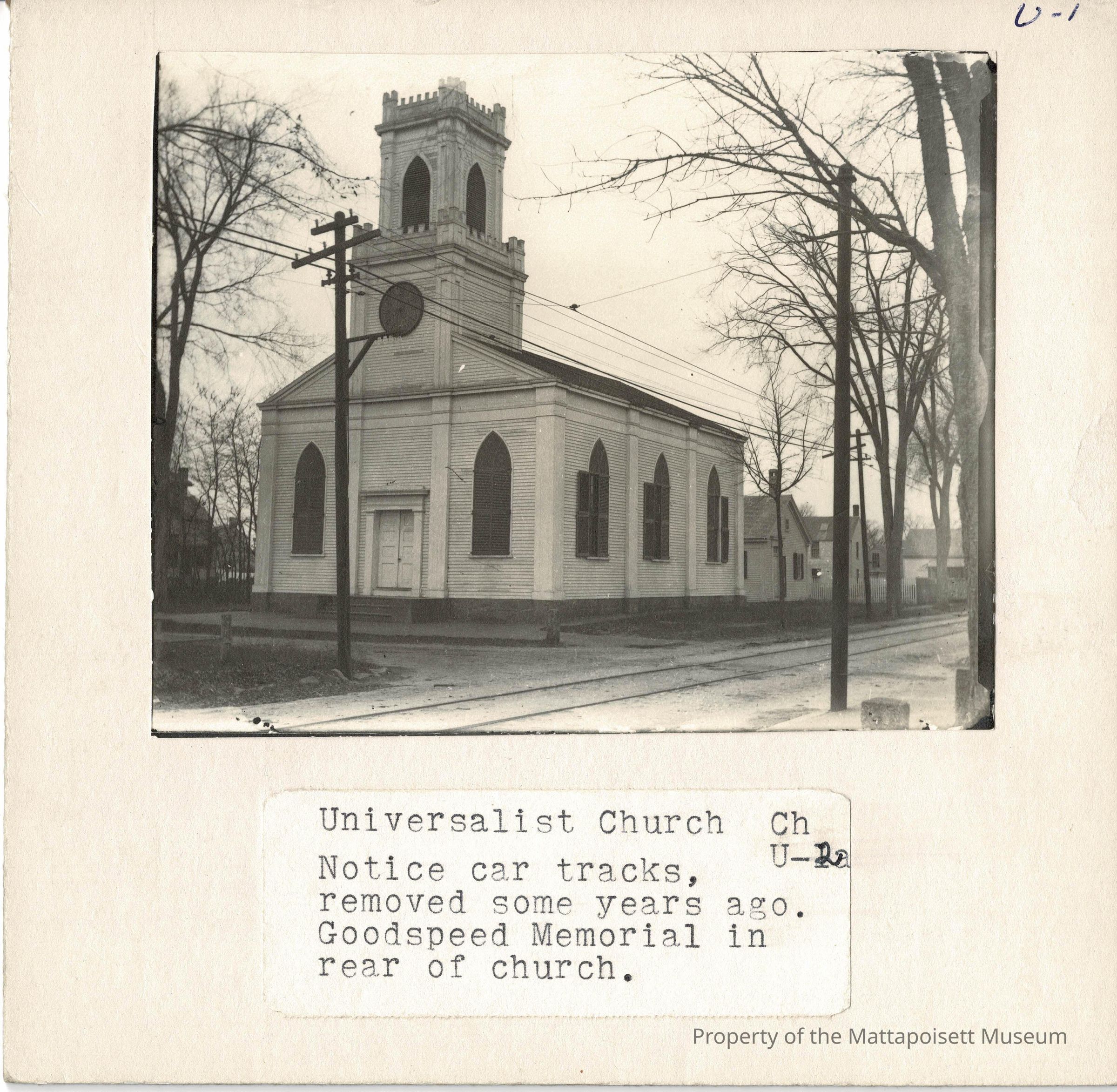 Photo of the Universalist Church on the corner of Barstow and Church Streets. Built in 1836, it was eventually torn down (c. 1953?) and replaced by an apartment building.Collection