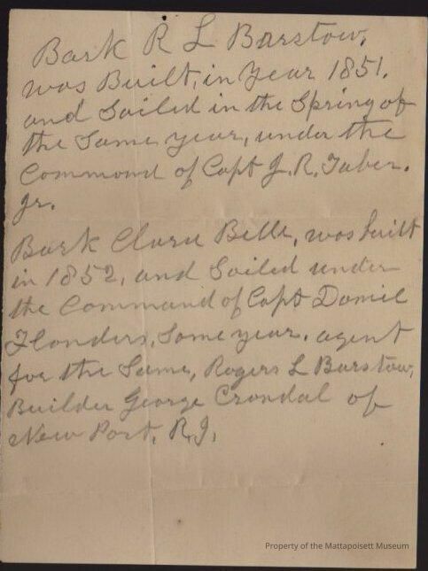 Notes on Bark R. L. Barstow, built in 1851 and Bark Clara Belle, 1852.Collection