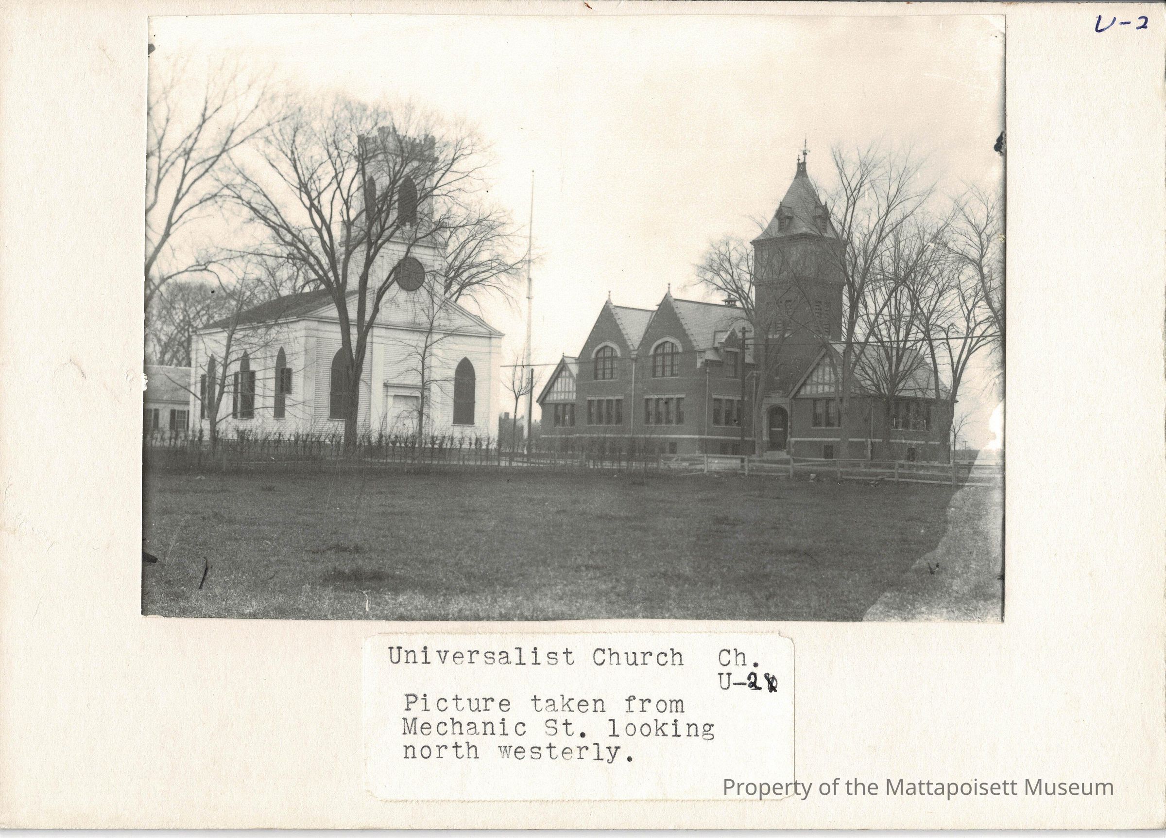 Photo of the Universalist Church on the corner of Barstow and Church Streets. Built in 1836, it was eventually torn down (c. 1953?) and replaced by an apartment building.Collection