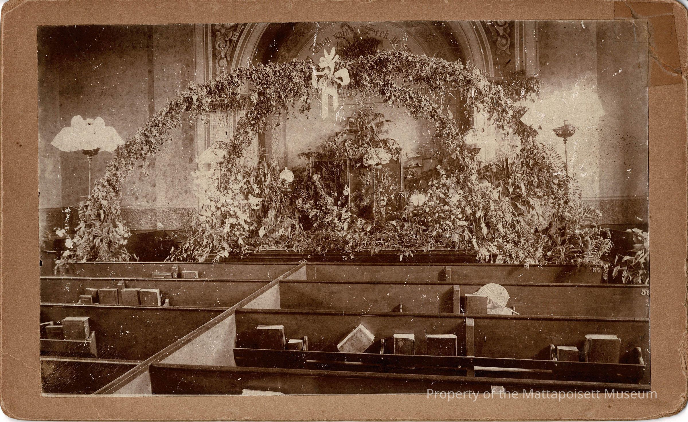 Photo of the Congregational Church on Church Street, built in 1842. Decorated for the marriage of Lemuel LeBaron Dexter and C.L. Hammond.Collection
