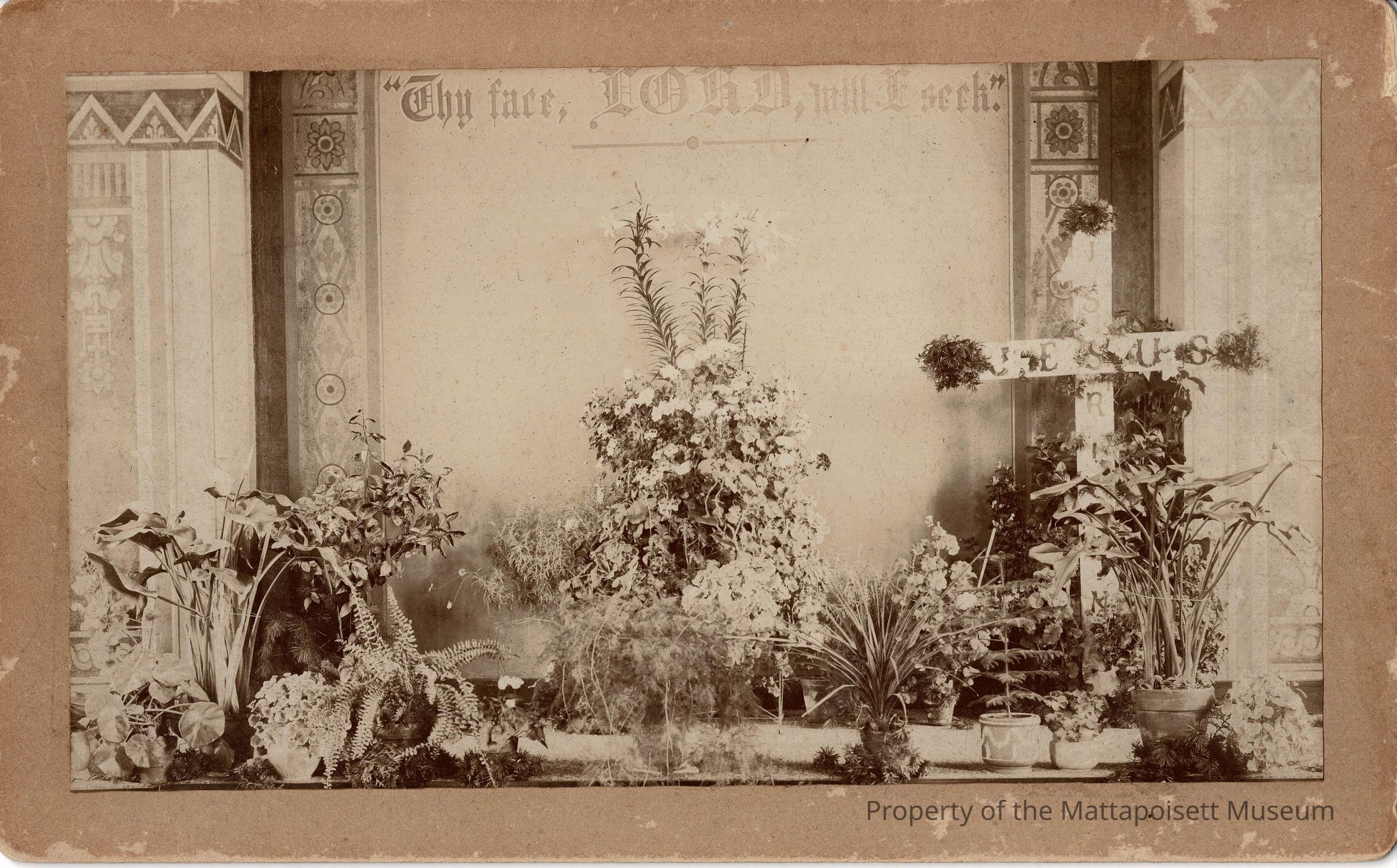 Photo of the Congregational Church on Church Street, built in 1842. Decorated for the marriage of Lemuel LeBaron Dexter and C.L. Hammond.Collection