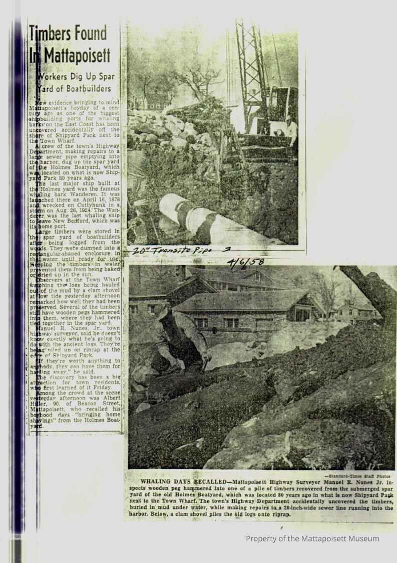 Newspaper article, copy, "TImbers found in Mattapoisett" Workers dig up spar yard of boatbuilders.Collection