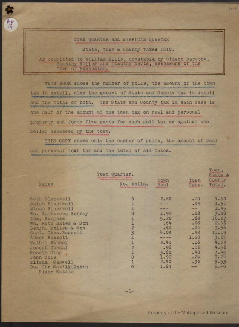 Town quarter and Sippican quarter, state, town & county taxes, 1810. Committed to William Ellis, town constable, Gideon Barstow, Timothy Hiller and Timothy Davis, Assessors of Rochester.Collection