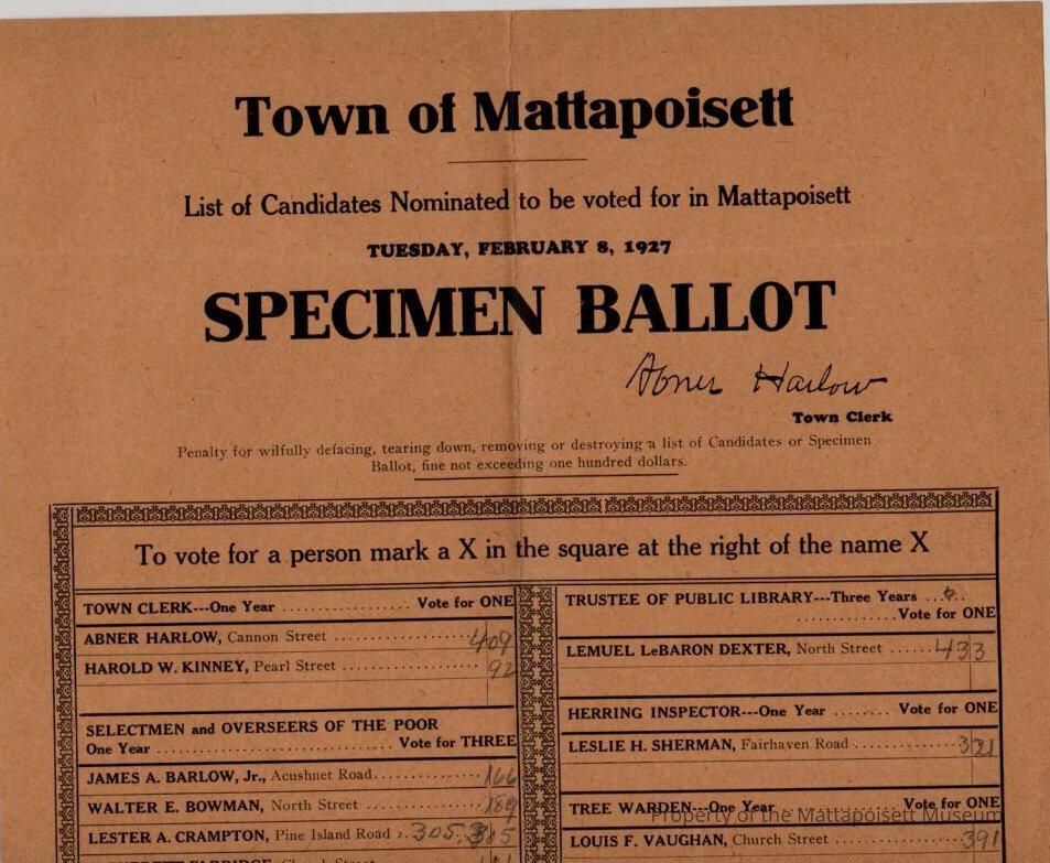 List of candidates nominated to be voted for in Mattapoisett, Specimen Ballot. Abner Harlow, Town Clerk.Collection