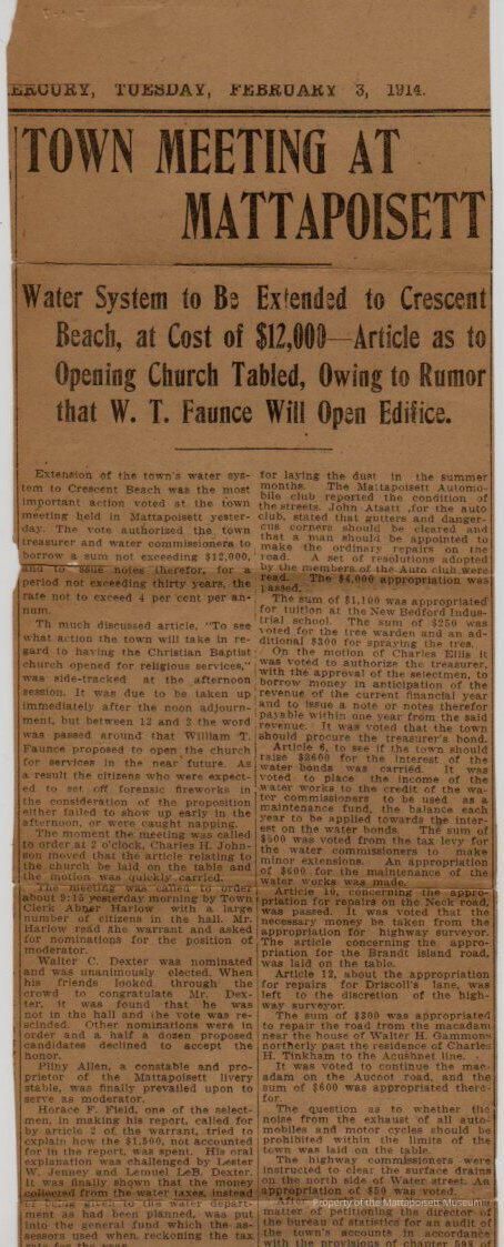 Mercury article "Town Meeting at Mattapoisett" Water System to be Extended to Crescent Beach, at Cost of $12,000 - Article as to Opening Church Tabled, Owing to Rumor that W. T. Faunce will Open Edifice.Collection
