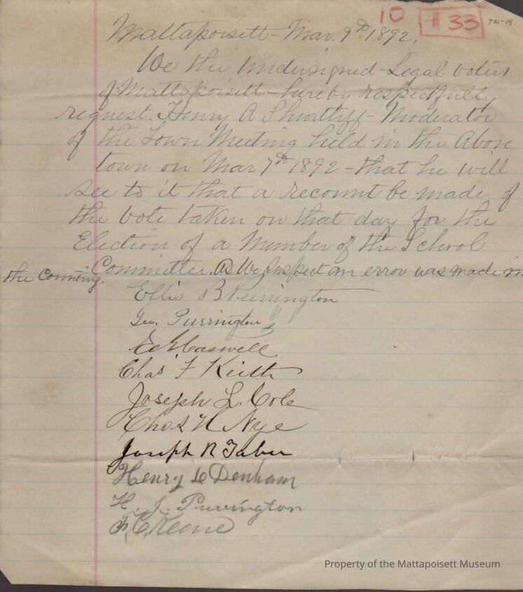 To Town Clerk of Mattapoistt, request a recount of the votes at annual town meeting for various officers.Collection