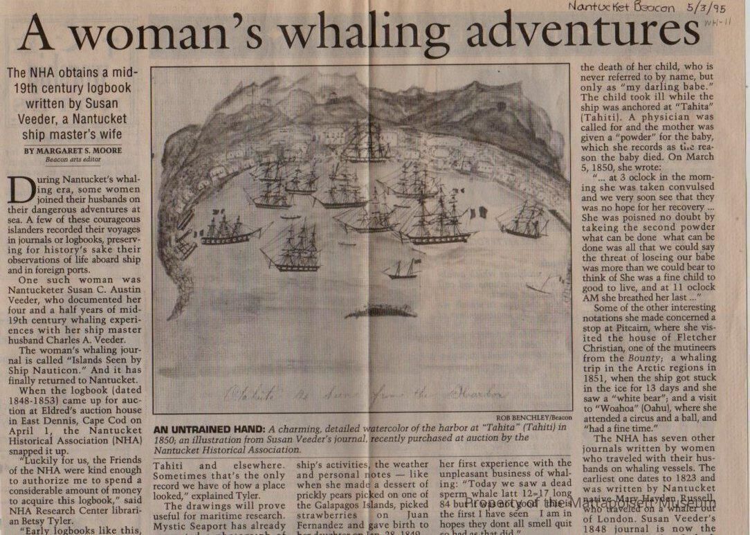 Nantucket Beacon newspaper article "A woman's whaling adventures" Susan Veeder's journal at the Nantucket Historical Association.Collection