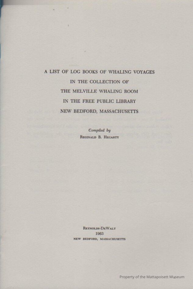 A List of Log Books of Whaling Voyages in the Collection of the Melville Whaling Room in the Free Public Library New Bedford, Massachusetts. Compiled by Reginald B. Hegarty.Collection