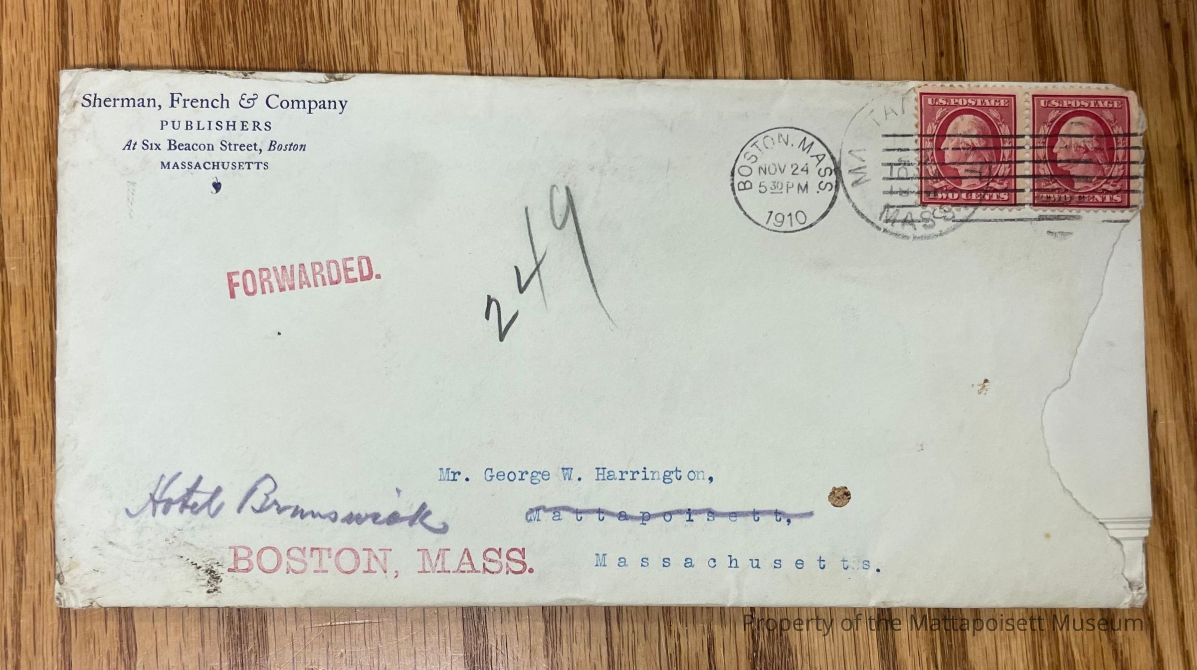 A letter from Sherman, French & Co. Publishers to George W. Harrington, 1910.Subject