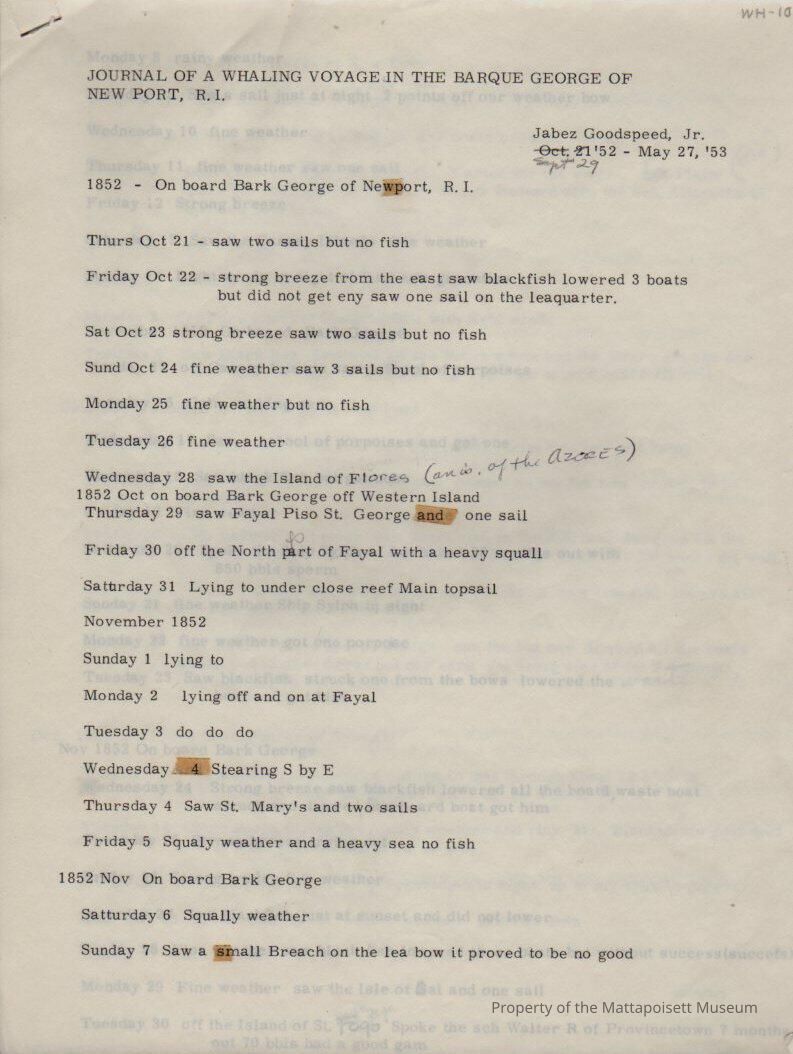 Journal of a whaling voyage in the Barque George of Newport, RI. Jabez Goodspeed Jr. Transcript only.Collection