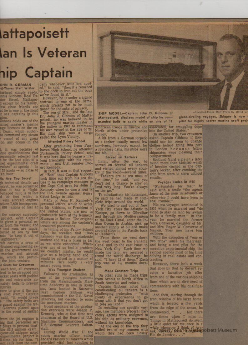 Newspaper article "Mattapoisett Man is Veteran Ship Captain". John D. Gibbons.Collection