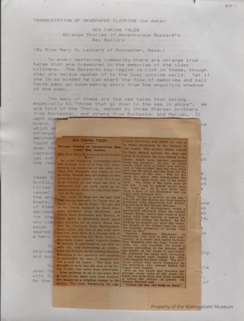 Newspaper article "Sea Faring Tales", Strange stories of adventurous Buzzard's Bay sailors. By Miss Mary H. Leonard of Rochester. Transcription.Collection