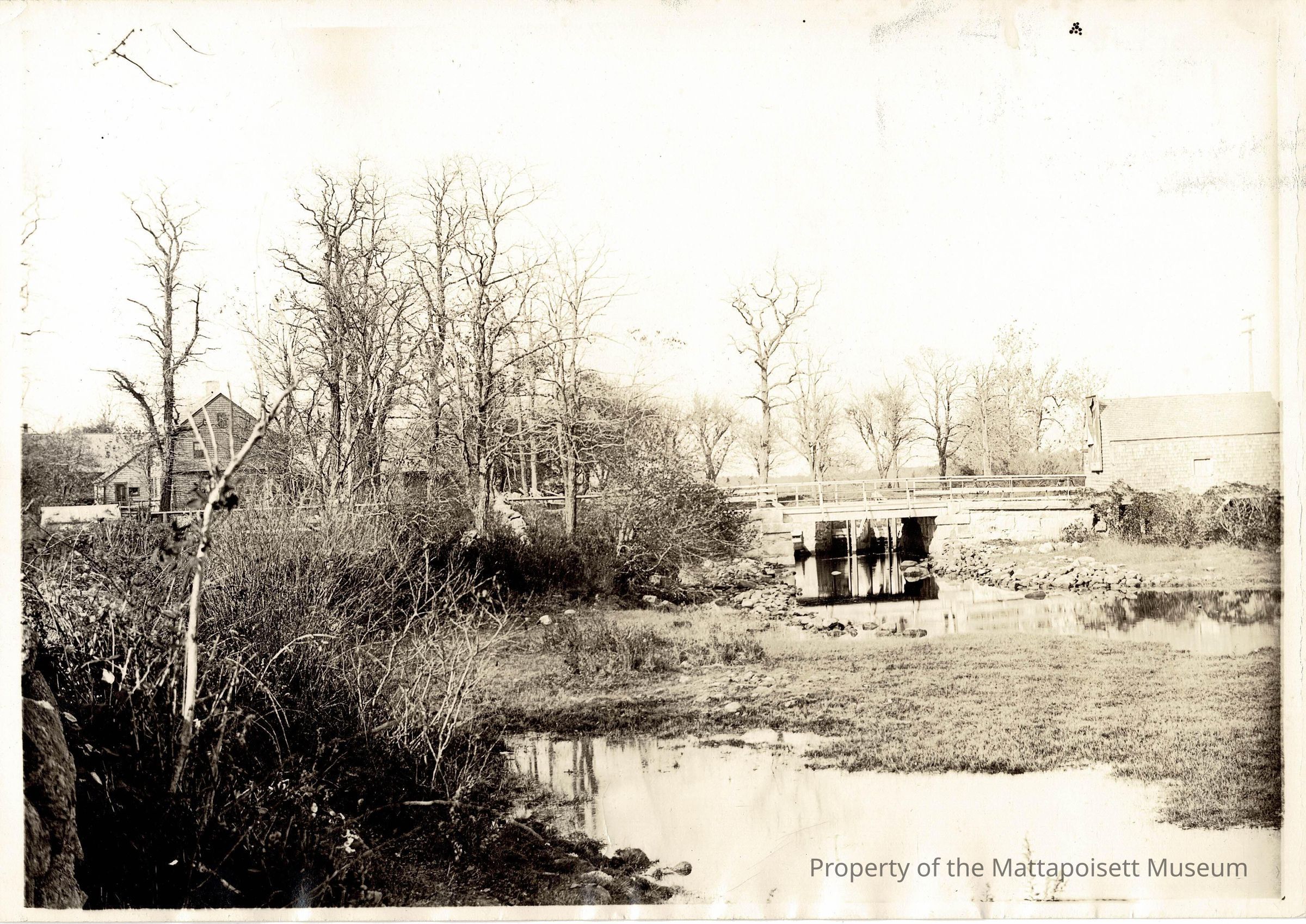 Photograph of the Mattapoisett River and surroundings. Looking south from the Herring Weir. At left is the John Hammond house (torn down 1910), then the herring house. At right the town grist mill.Collection