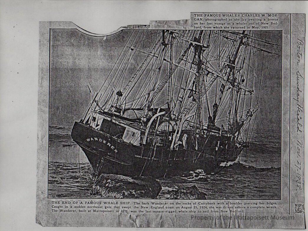 Boston Sunday Herald article photocopy and picture "The End of a Famous Whale Ship", Bark Wanderer on the rocks at Cuttyhunk.Collection