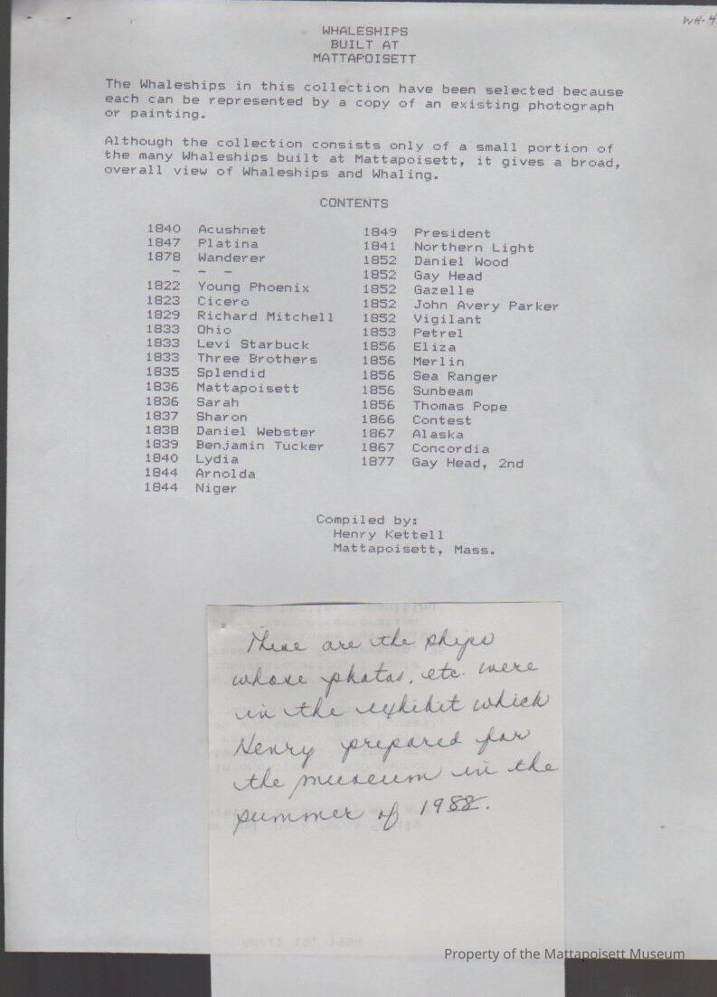 List of Whaleships built at Mattapoisett. These are the ships whose photos, etc. were in the exhibit which "Henry" prepared for the museum in the summer of 1988. Compiled by Henry Kettell.Collection