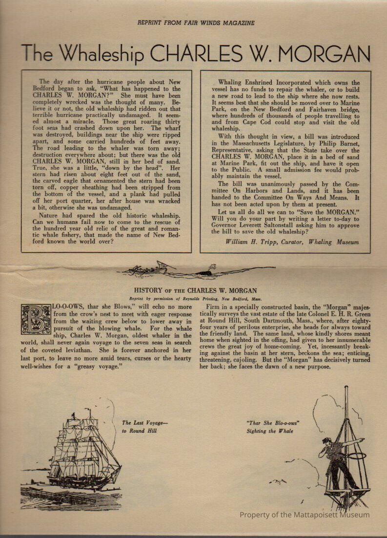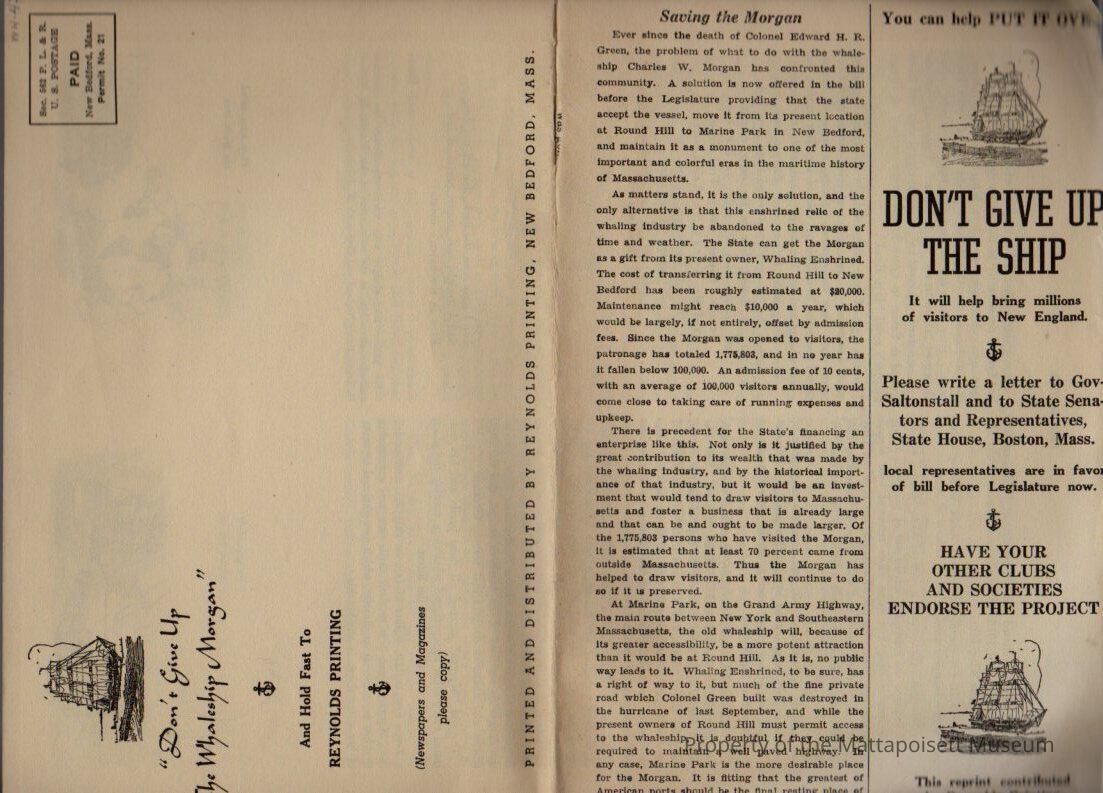 Flyer to save the Charles W. Morgan, whaleship. "Don't Give up the Ship", history and write-up.Collection