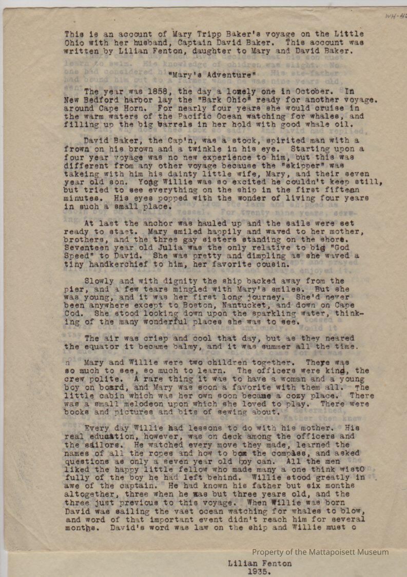 Account of Mary Tripp Baker's voyage on the Little Ohio with her husband, Captain David Baker. This account was written by Lilian Fenton, daughter of Mary and David Baker.Collection