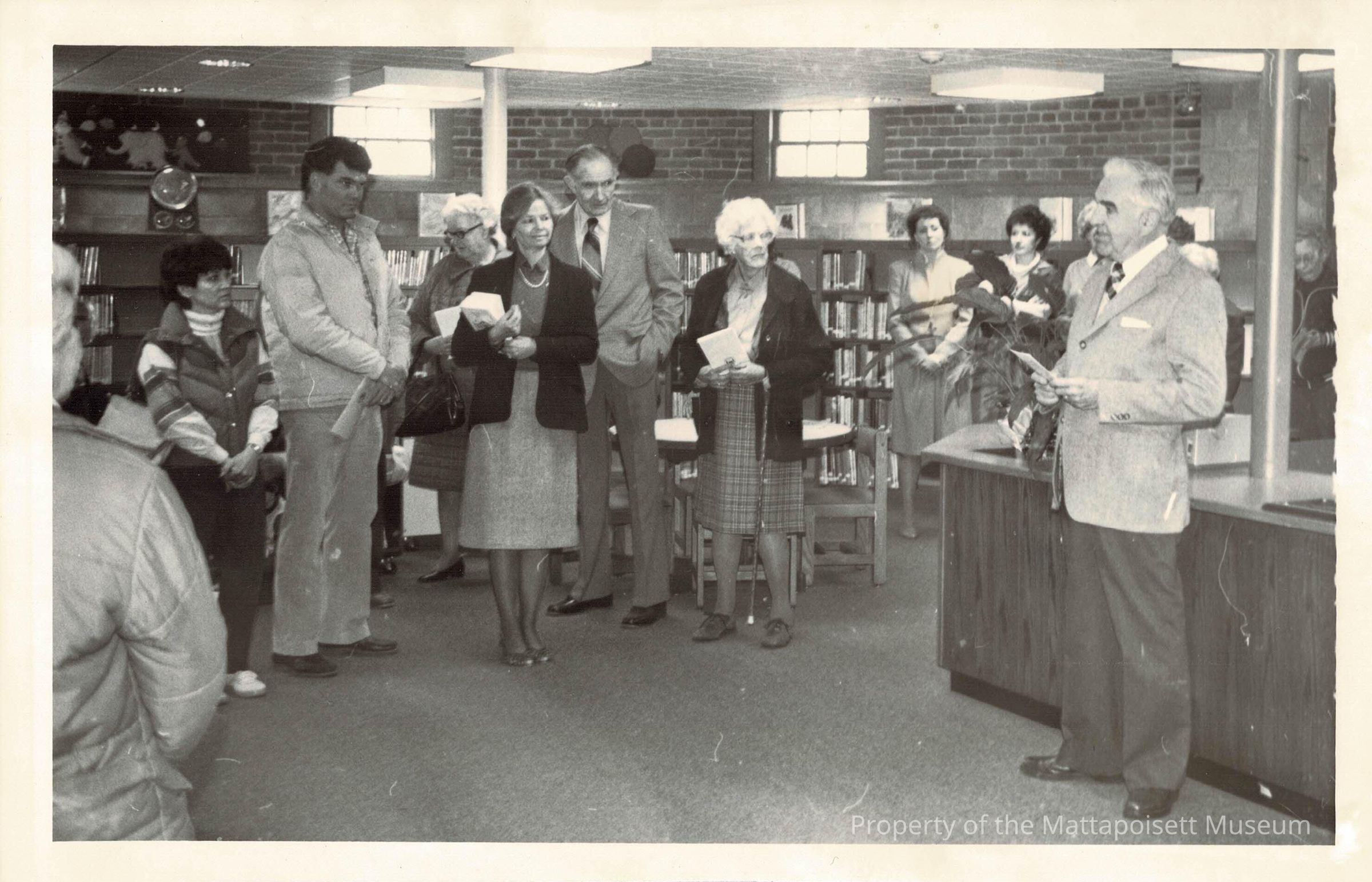 Photograph of dedication of a dedication in the children's room of the Mattapoisett library, c. 1983.Collection