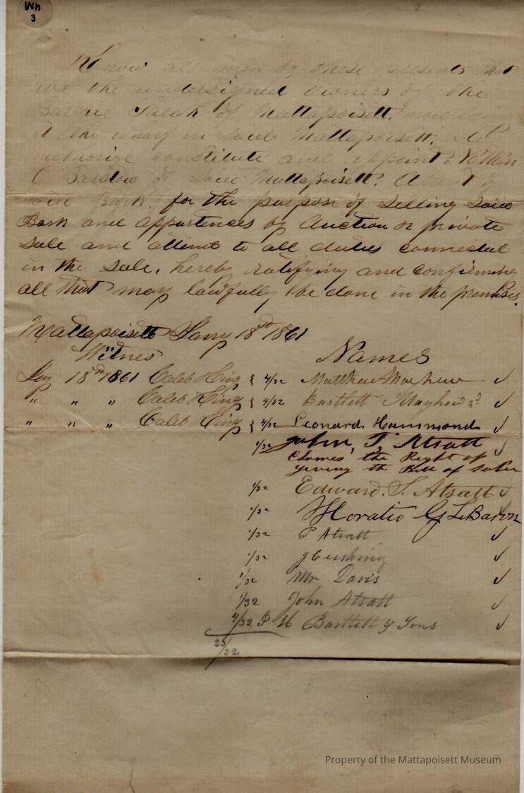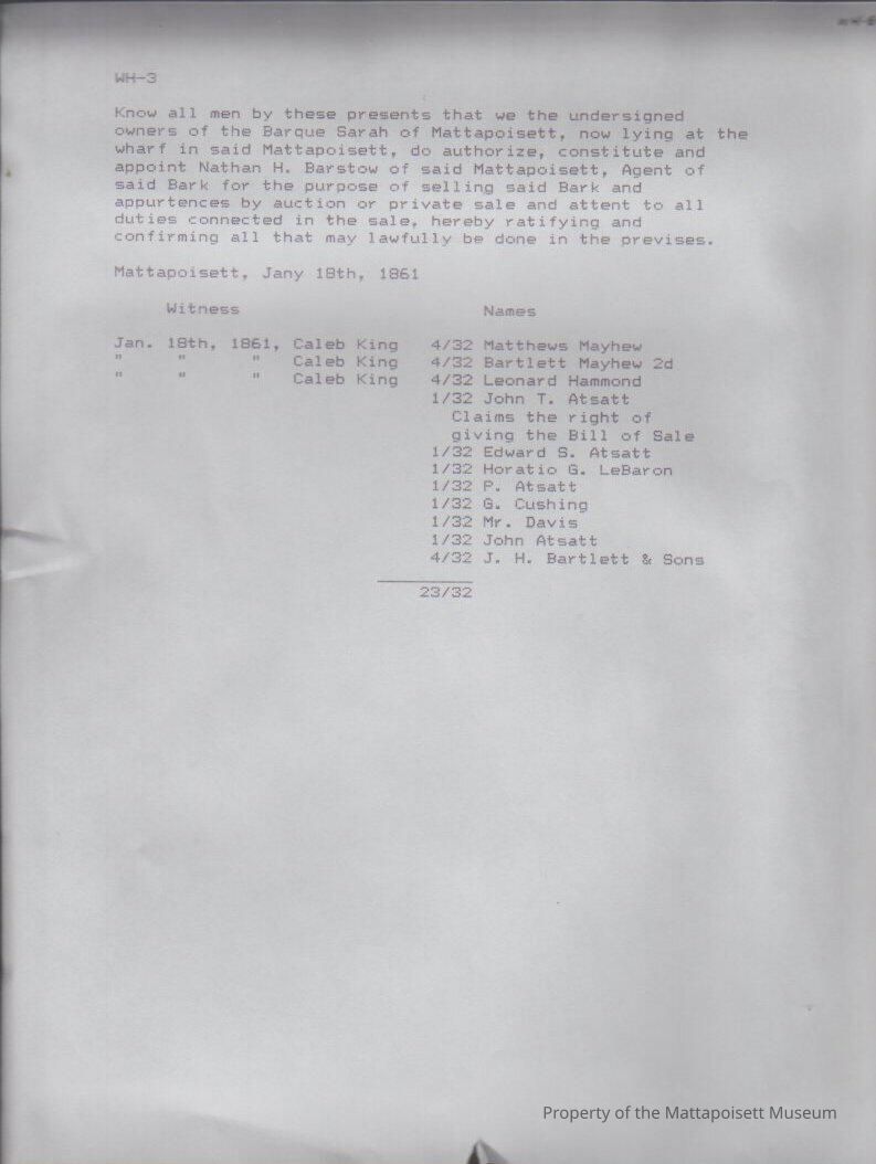 Notice of auction for sale of Bark Sarah of Mattapoisett. Transcript. Signed by owners.Collection