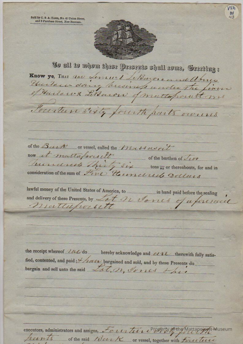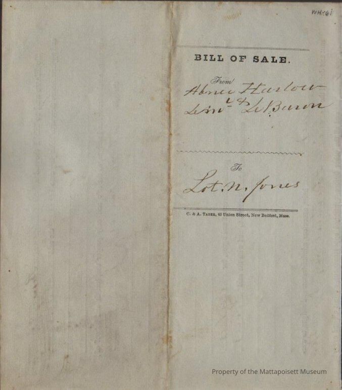 Bill of sale from Abner Harlow and Lemuel LeBaron to Lot N. Jones for Bark Massasoit.Collection