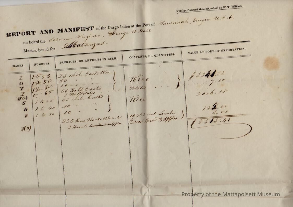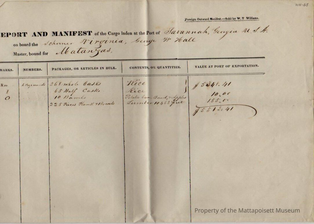 Report and Manifest of Schooner Virgina, George W. Hall while in port of Savannah Georgia on route to Matangas.Collection