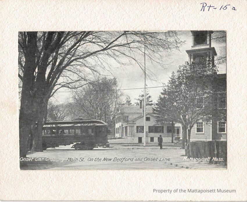 Photograph of the New Bedford and Onset Street Railway trolley crossing Main Street in Mattapoisett.Collection