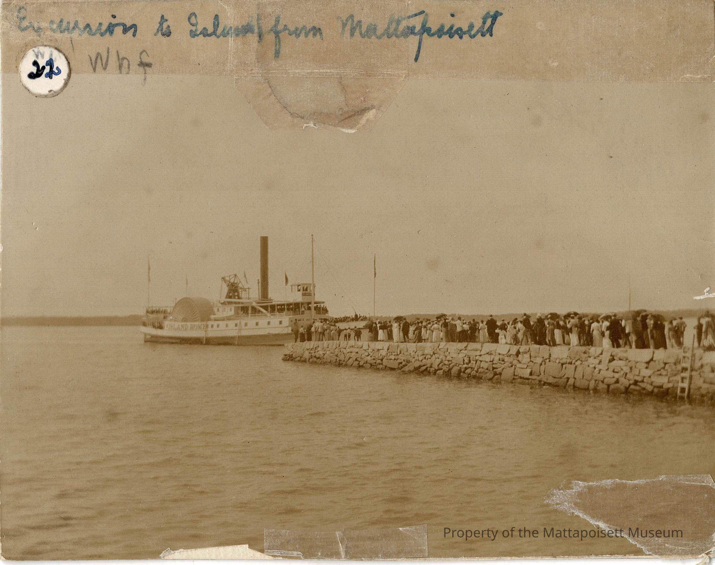 Photograph of a ferry at the Mattapoisett wharves. Boat and destination unknown.Collection
