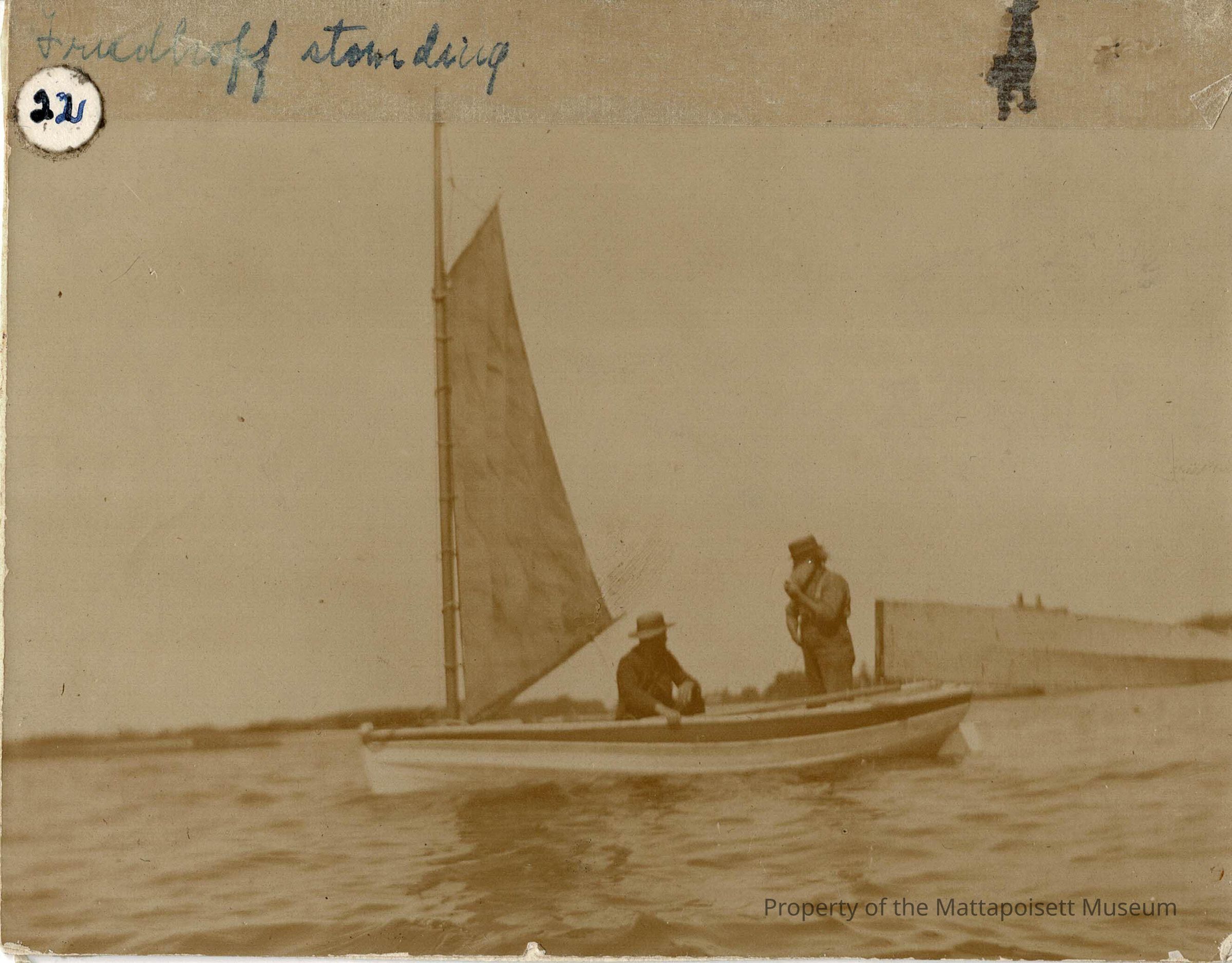 Photograph of two men in a small sailboat. Labeled "Friedhoff standing".Collection