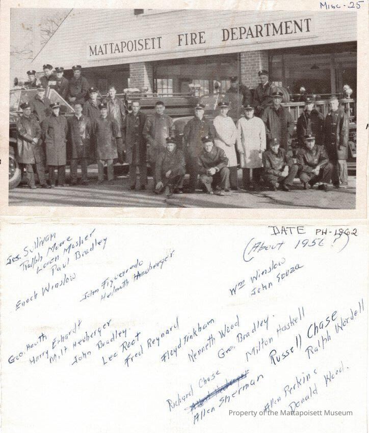 Photograph of the Mattapoisett fire department staff in front of the fire station.
