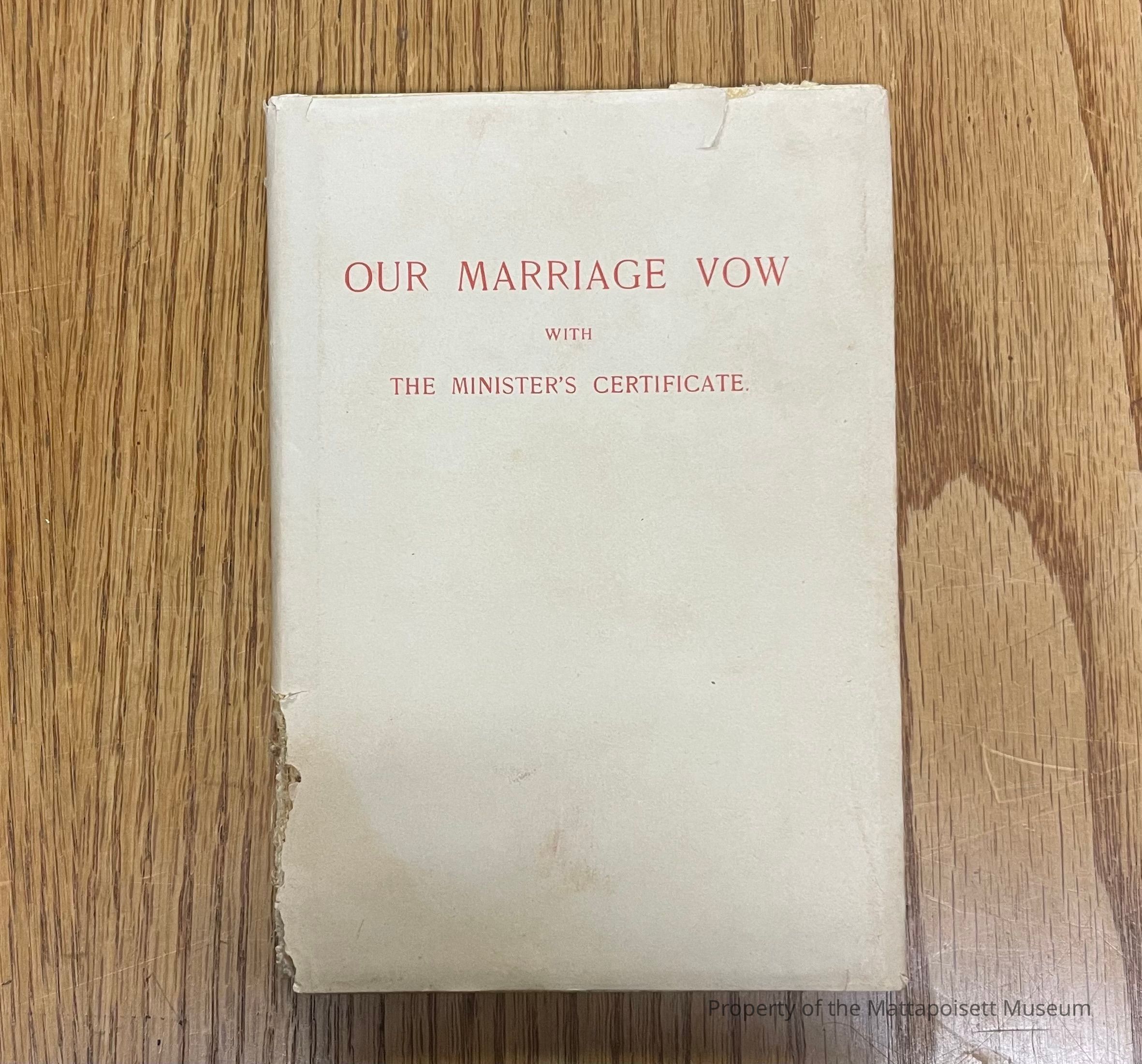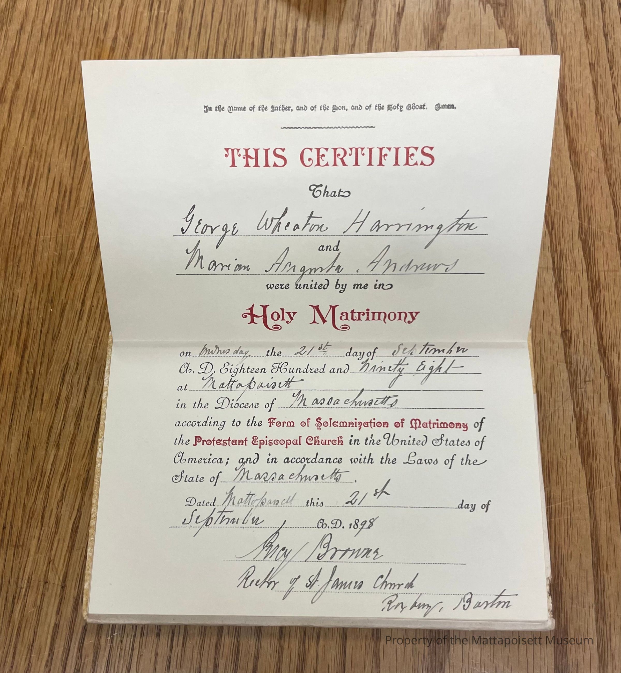 George W. Harrington Collection - personal items: George Harrington and Marian Andrews' wedding/minister's certificate booklet. They were married on September 21st, 1898, in St. Philip's Church on Water Street in Mattapoisett.