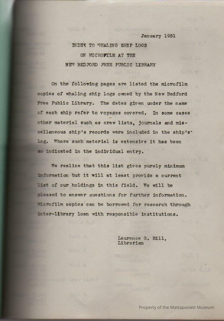 Index to Whaling Ship Logs on microfilm at the New Bedford Public Library. Laurence G. Hill, Librarian.Collection