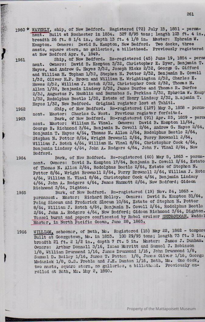 Copy of Report of Commissioner of Fish and Fisheries/History of the American Fishery. Copy of New Bedford Whaling Vessel Registry of Ship Waverly (burnt and papers confiscated by Rebel cruiser Shenandoah).Collection