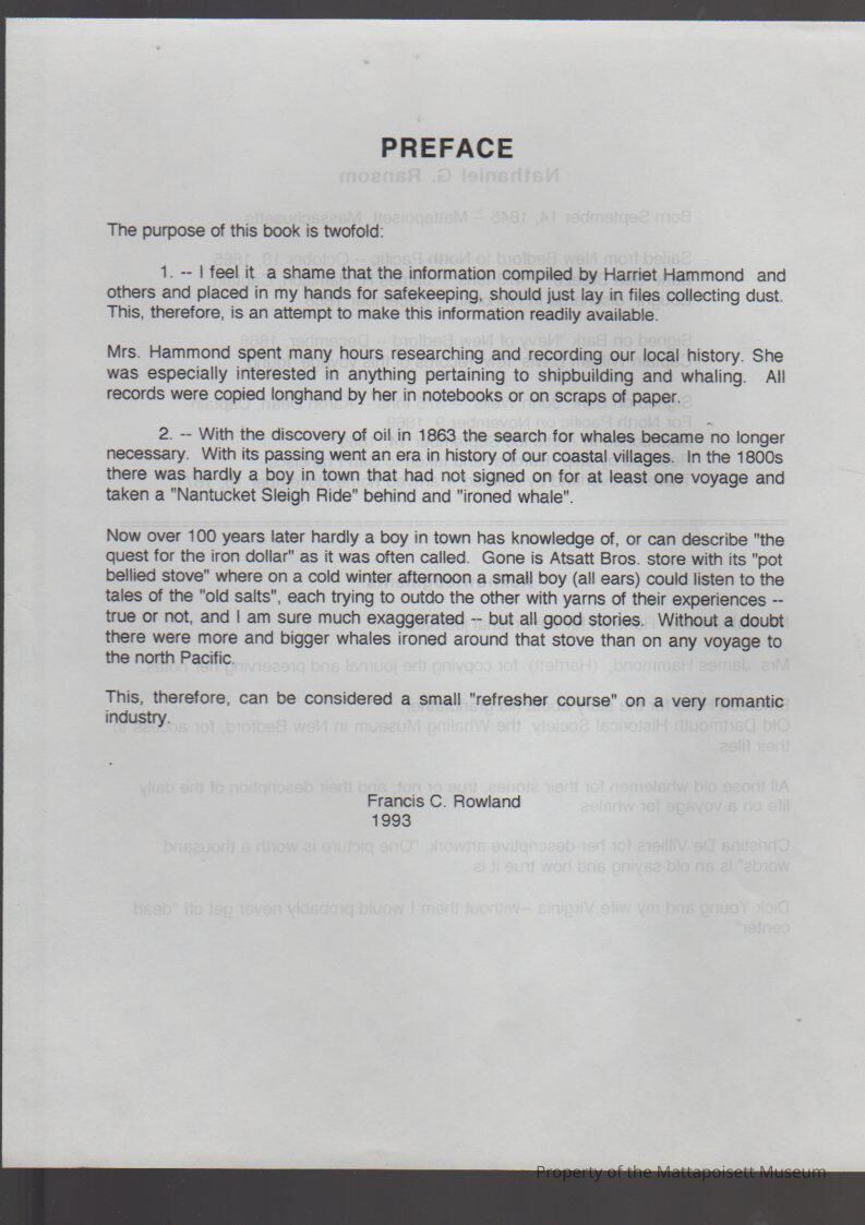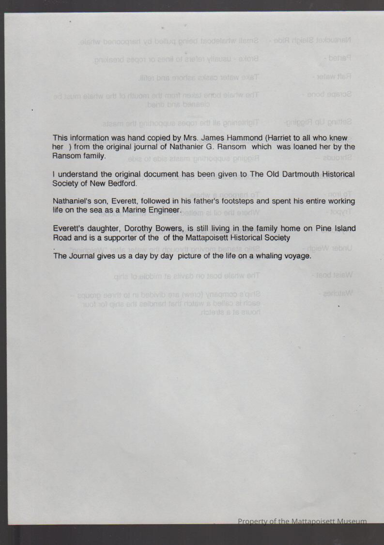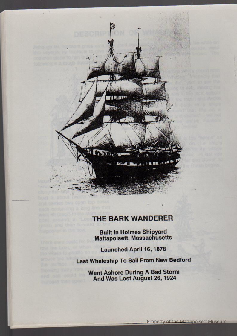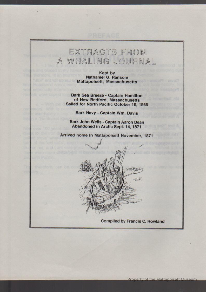 Booklet compiled by Francis C. Rowland, information from Mrs. James (Harriet) Hammond from the journal of Nathaniel G. Ransom, given to the Old Dartmouth Historical Society "Extracts from a Whaling Voyage". Also, information on The Bark Wanderer.Collection