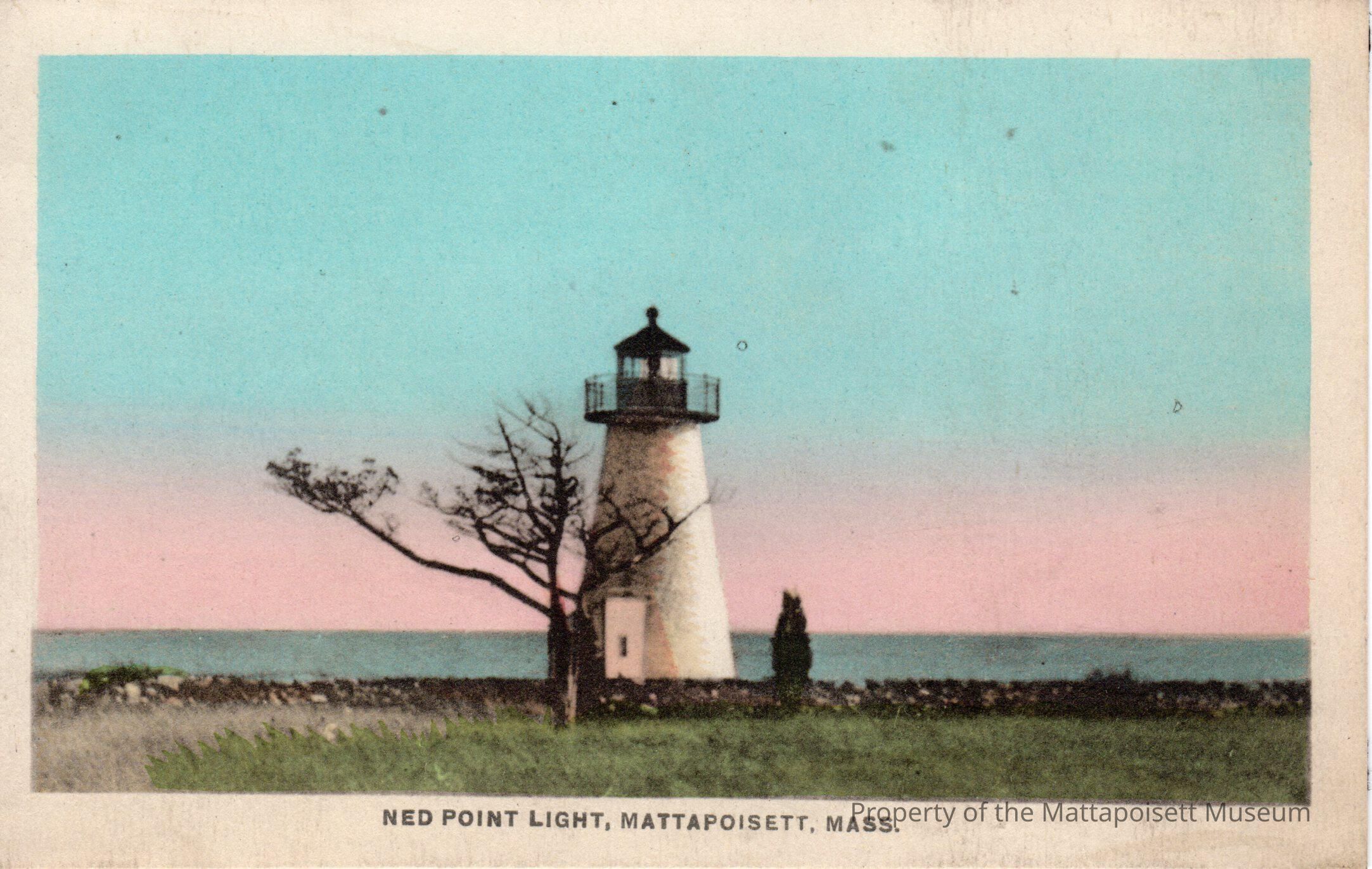 Color postcoard showing Ned's Point Light, Mattapoisett. No writing on back, but has black paper on corner in back from being mounted at one point.Acquisition