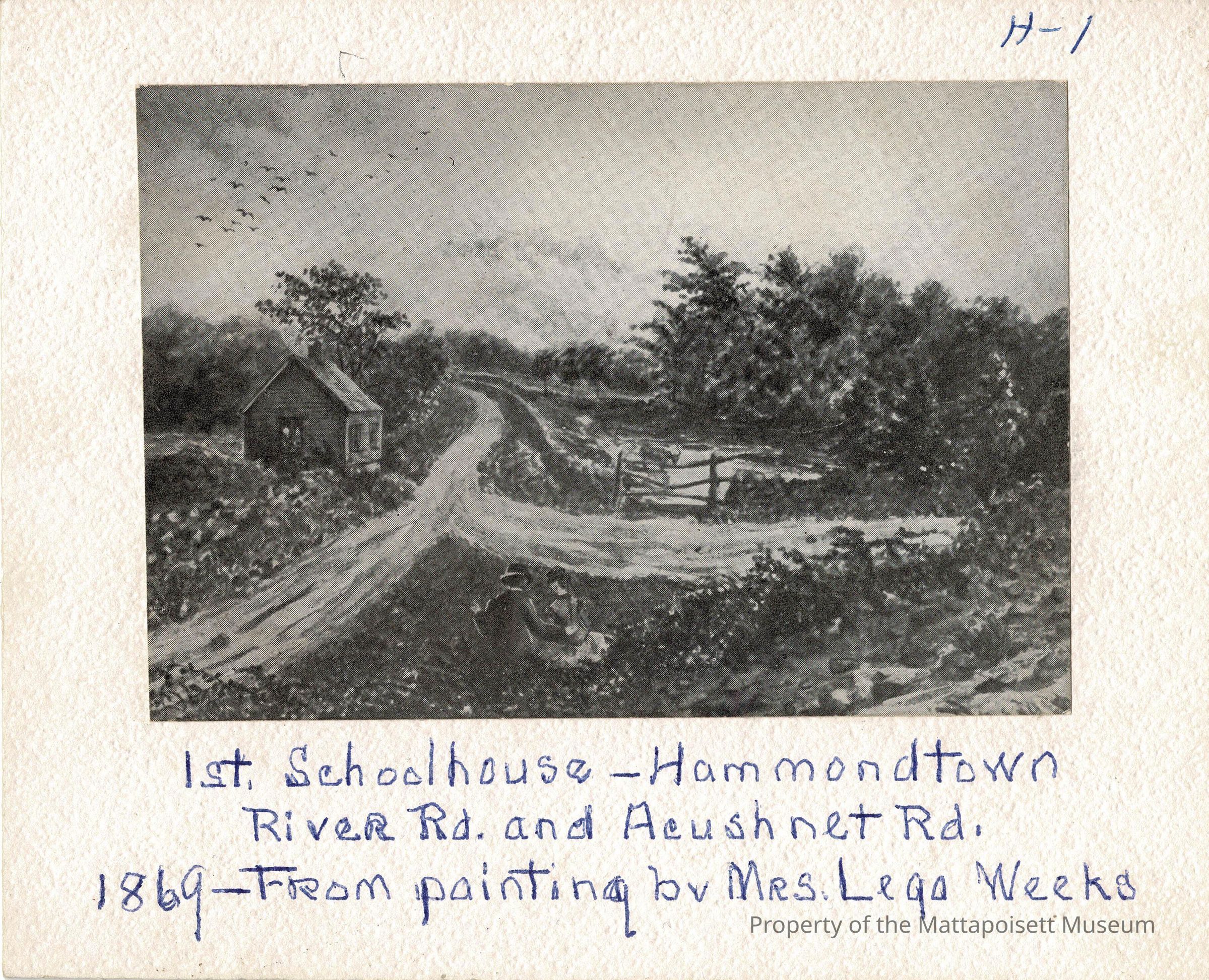 Print of the Hammondtown school on River and Acushnet Roads, from a painting by Clelia Lega Weeks c. 1869. This is believed to have been the oldest schoolhouse in town.Collection