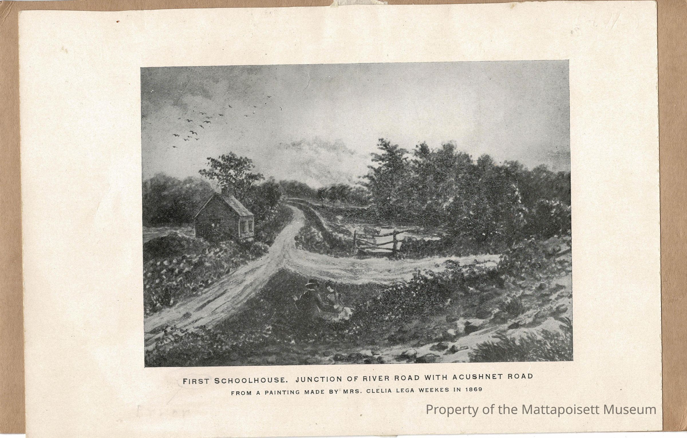 Print of the Hammondtown school on River and Acushnet Roads, from a painting by Clelia Lega Weeks c. 1869. This is believed to have been the oldest schoolhouse in town.Collection