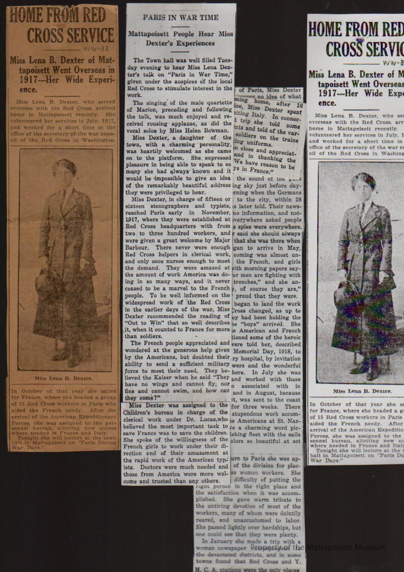 Newspaper article "Home from Red Cross Service", Miss Lena B. Dexter of Mattapoisett went overseas in 1917 – her wide experience. “Paris in War Time”, Mattapoisett people hear Miss Dexter's Experiences.Collection