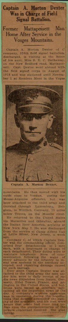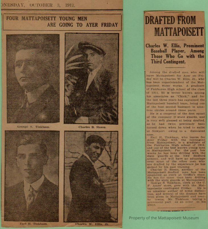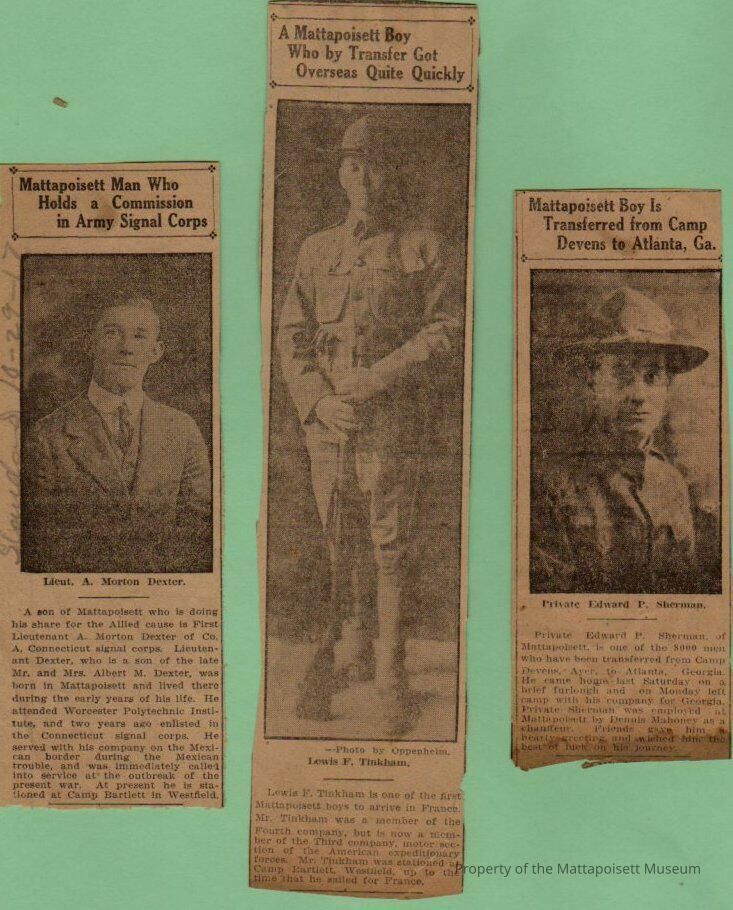 Newspaper articles of Mattapoisett men sent to war service. Lieut. A. Morton Dexter, Lewis F. Tinkham, Private Edward P. Sherman, George S. Tinkham, Charles B. Sisson, Earl H. Tinkham, Charles W. Ellis Jr. (prominent baseball player).Collection