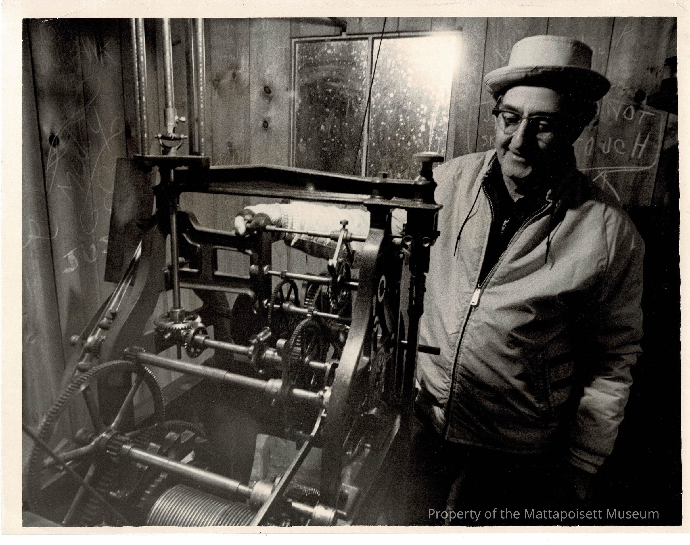 Photograph of John Figuieredo with the original Seth-Thomas clock works installed in the Mattapoisett Center School tower when the school was built in 1898.Collection