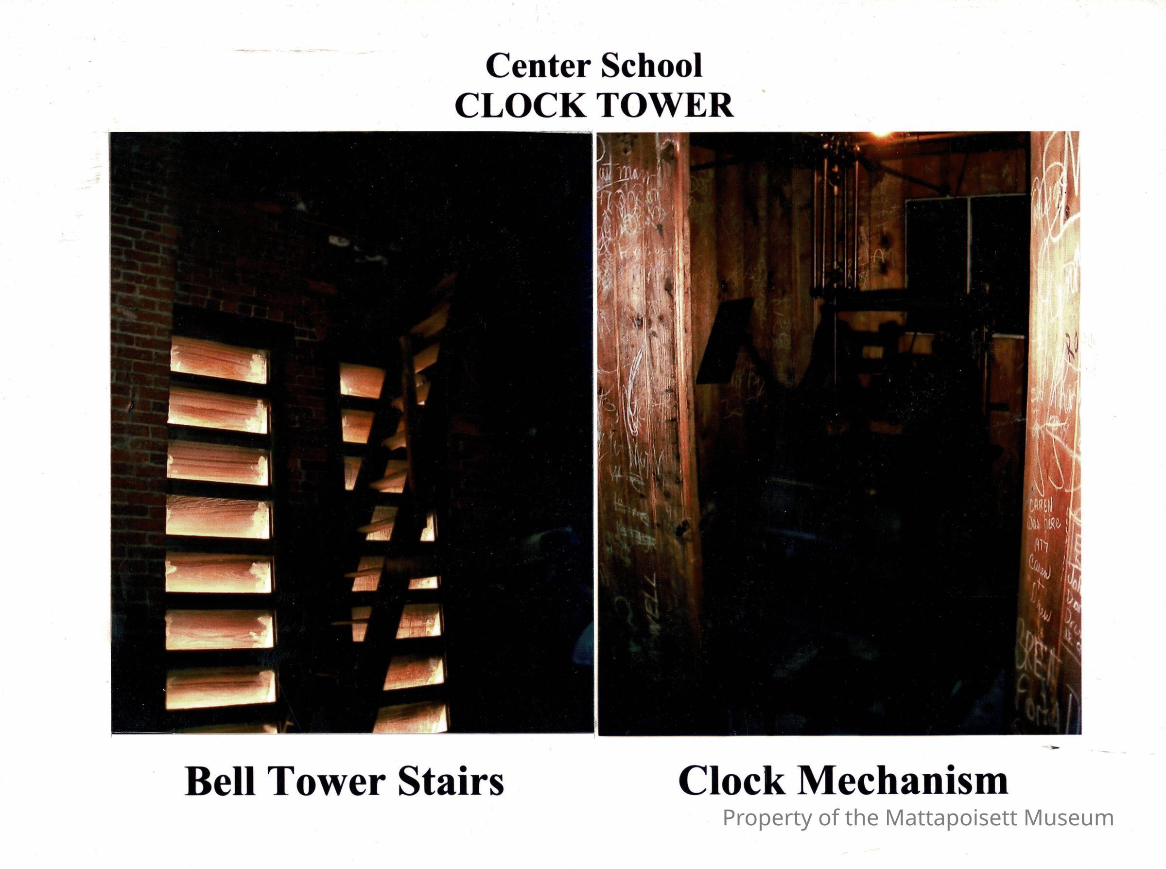 Two photographs of Mattapoisett Center School clock tower interior.Collection