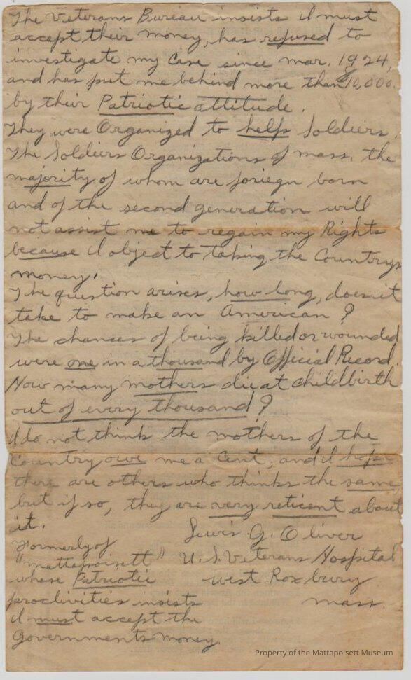 Letter from Lewis G. Oliver, U. S. Veterans Hospital, West Roxbury, Mass. Formerly of Mattapoisett whose Patriotic proclivities insists I must accept the governments money.Collection