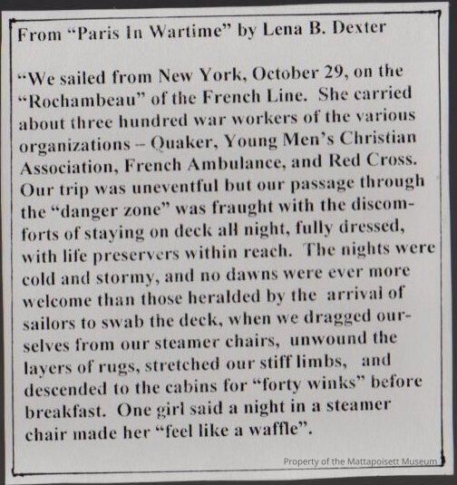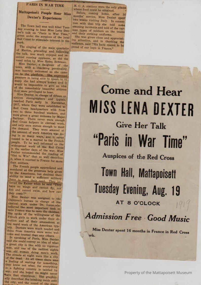 Flyer and newspaper article "Paris in War Time". Lena Dexter gives talk after 16 months in France in Red Cross. "Mattapoisett people hear Miss Dexter's experiences".Collection