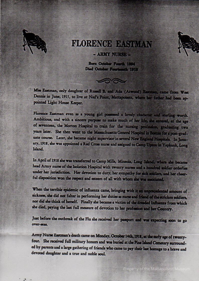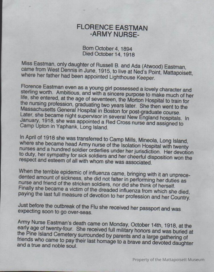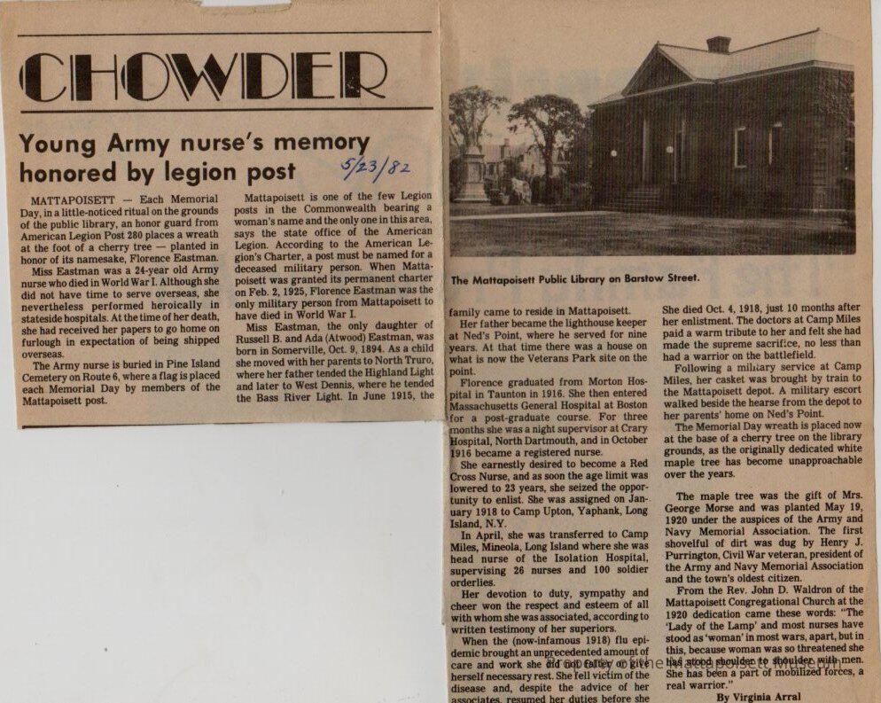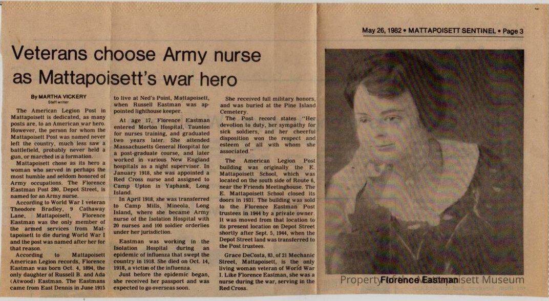 Description and Sentinel newspaper article of Florence Eastman, Army nurse. Lived at Ned's Point, Mattapoisett, where her father was Lighthouse keeper. “Veterans choose Army nurse as Mattapoisett's War Hero".Collection