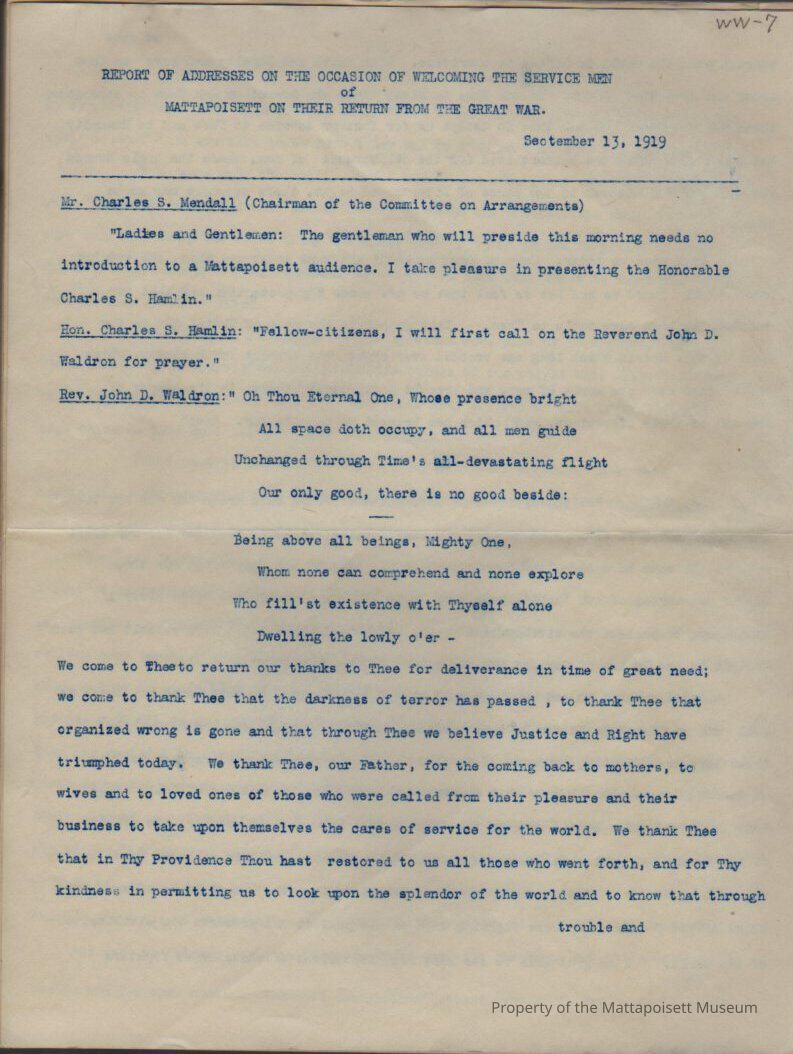 Report of addresses on the occasion of welcoming the service men of Mattapoisett on their return from the Great War.Collection