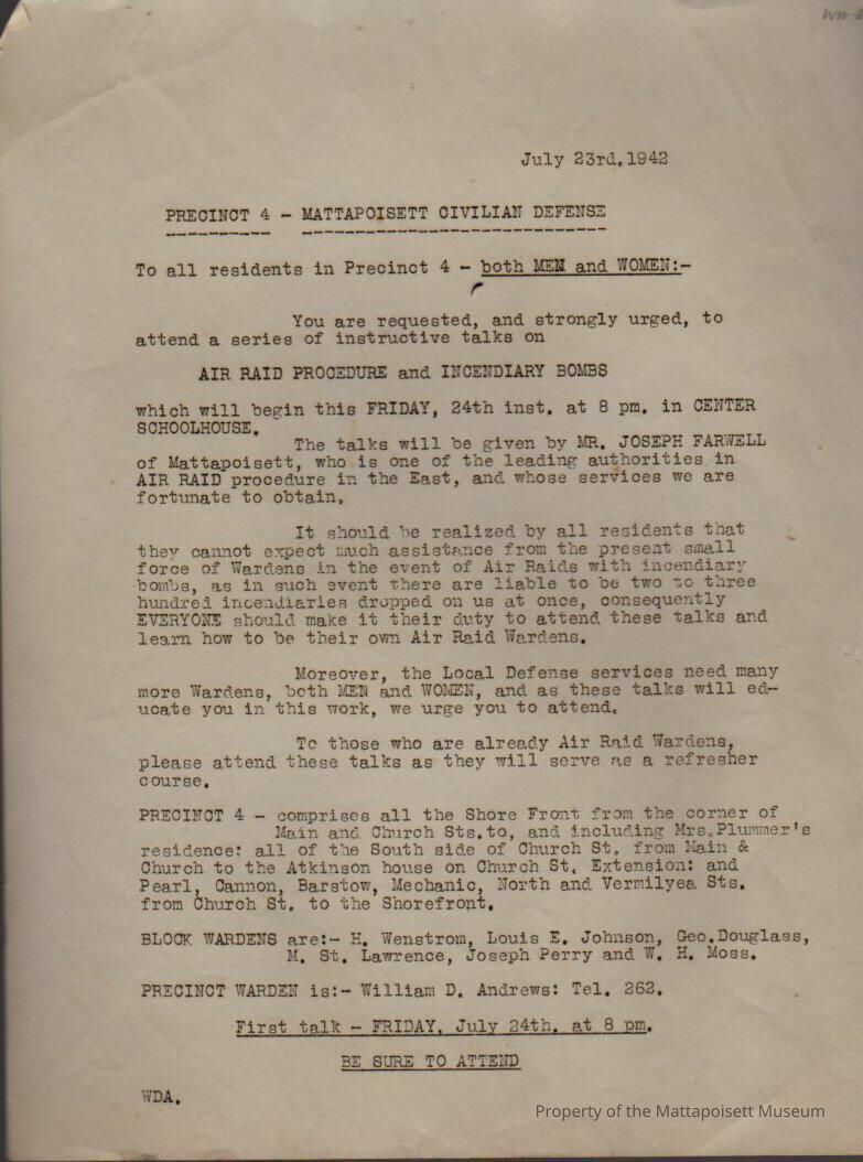 Mattapoisett Civilian Defense, precinct 4. Air raid procedure and incendiary bombs.Collection