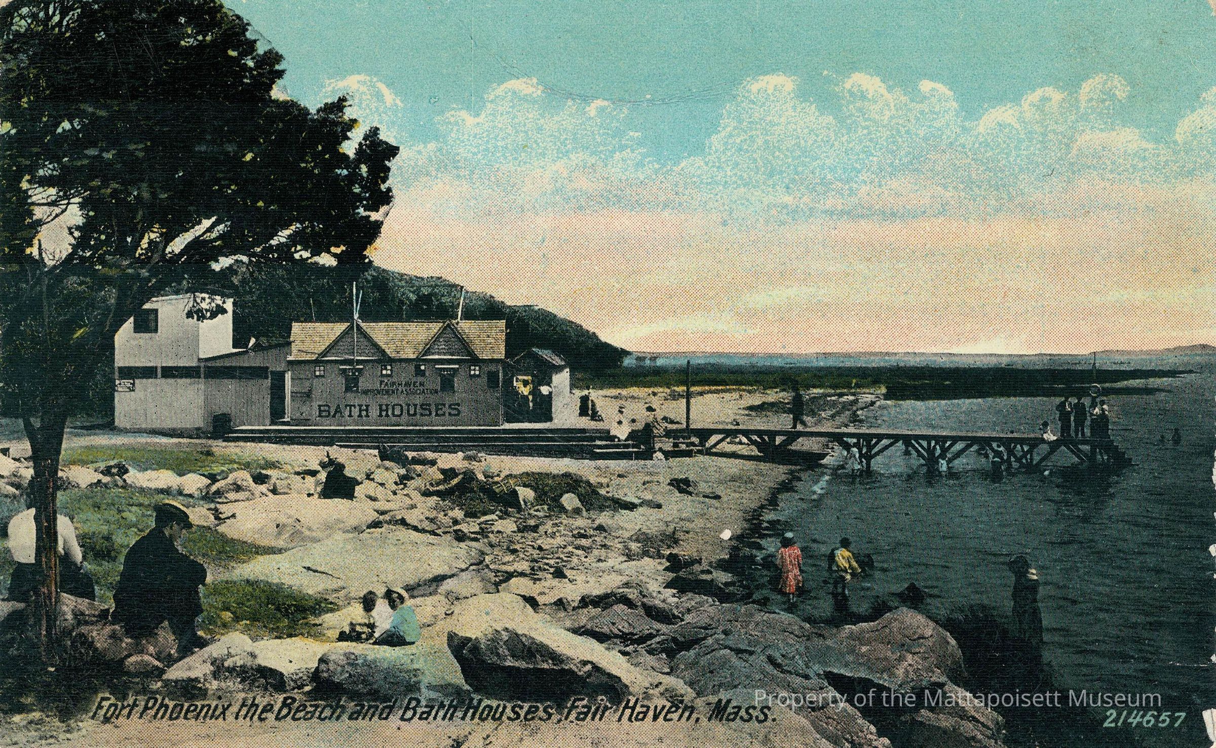 Hand-colored postcard showing Fort Phoenix the Beach and Bath Houses, Fairhaven, Mass.Collection