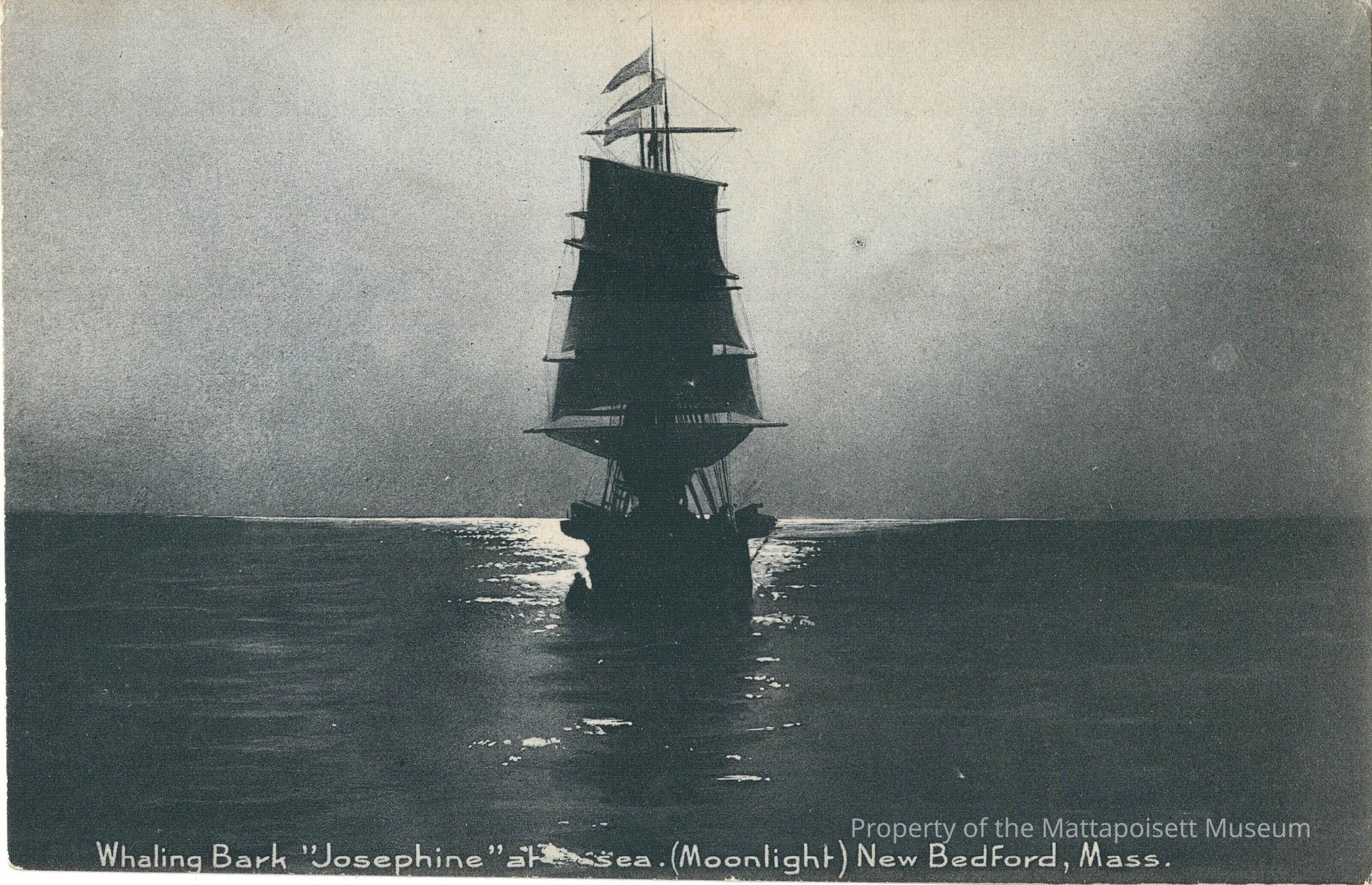 Black and white postcard showing Whaling Bark "Josephine" , about sea, (Moonlight), New Bedford, Mass.Collection