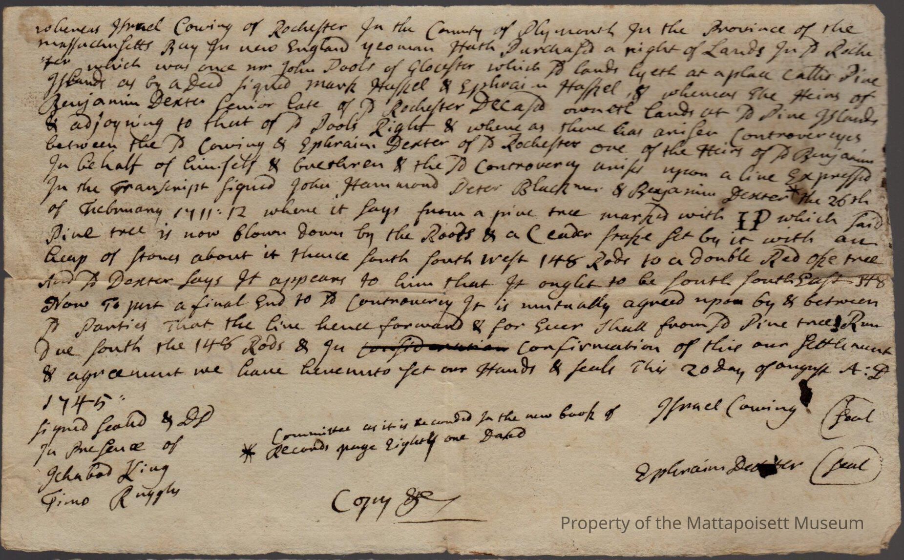 Copy of agreement Israel Cowing and Ephraim Dexter, deed for land on Pine Island.Collection