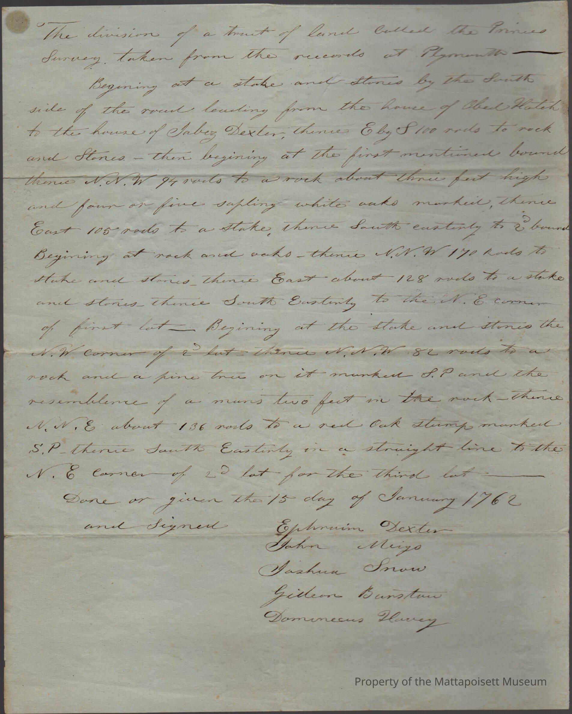 Division of a tract of land called the Pines, survey taken from records. Ephraim Dexter, John [Meiyo], Joshua Snow, Gideon Barstow, Domineaus Harvey.Collection