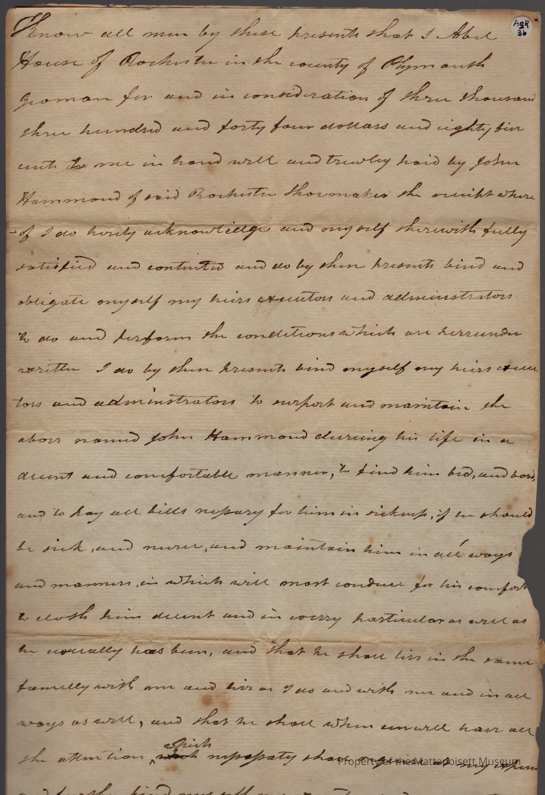 Abel House and John Hammond, to care for John Hammond during his life in a "decent and comfortable manner.Collection